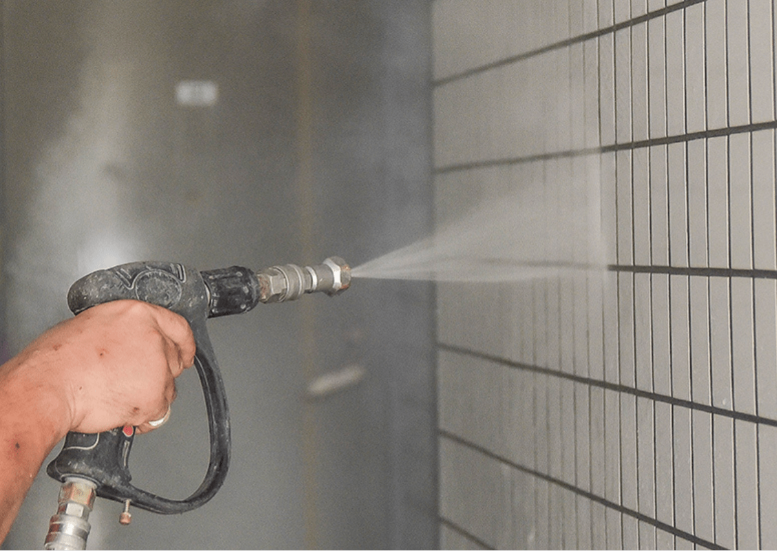 足場架設の次には、高圧洗浄を行います。高圧洗浄では、塗装をする前に、外壁についている汚れや不純物、特にコケやカビ、チョーキング現象によって浮き出た粉などをしっかり取り除き、塗装に適する塗布面に仕上げることが目的です。