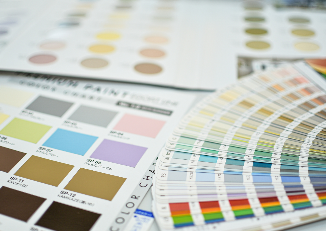 工事を始める前に『塗装デザイン』を選んでいただきます。色から選ぶお客様もいますし、デザイン集から選ぶお客様もいますし、近くのお家の事例を見て「あんな感じ♪」と言われる方もおられます。